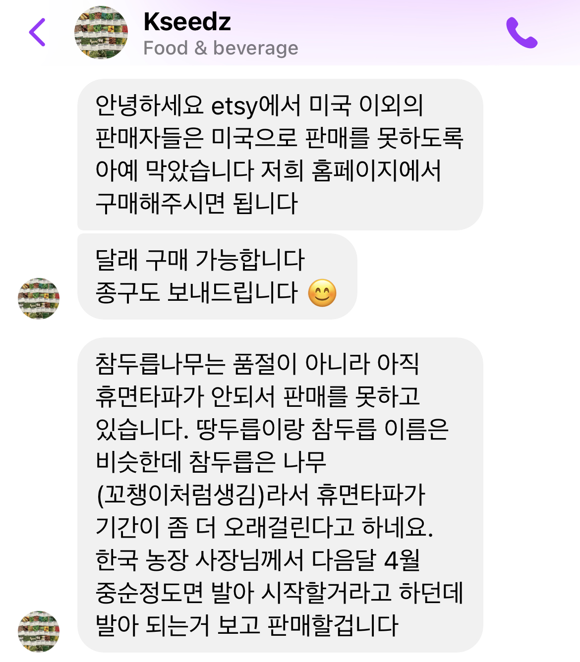 Etsy에도 한국 씨앗 판매하는 분들이 꽤 된다. 미국 온 첫해에 한국씨앗을 구하려고 주문했던 곳도 있고, 2년째 내가 미나리를 주문하는 곳도 있다. 전반적으로 미국 내 판매자들이 많아 통관 문제가 없다는 점이 장점이다.