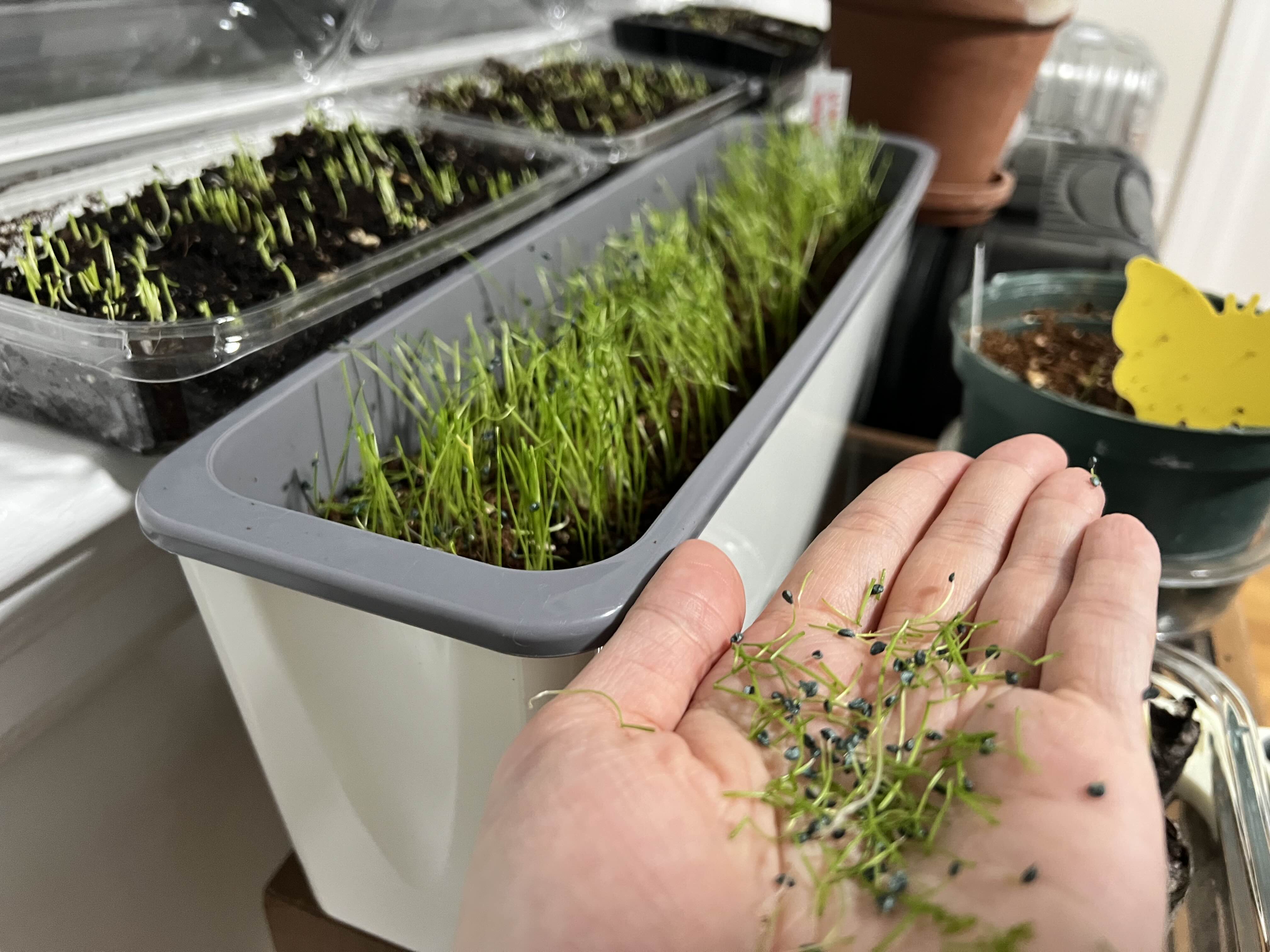 확실히 물에 뿌리가 빠진채로 길렀던 저번 파종분과 다르게 물을 제한적으로 주며 키운 이번 파종분이 더 싱싱한 것 같다. 씨앗껍질부분을 잘라주니 진하게 대파향이 올라온다.