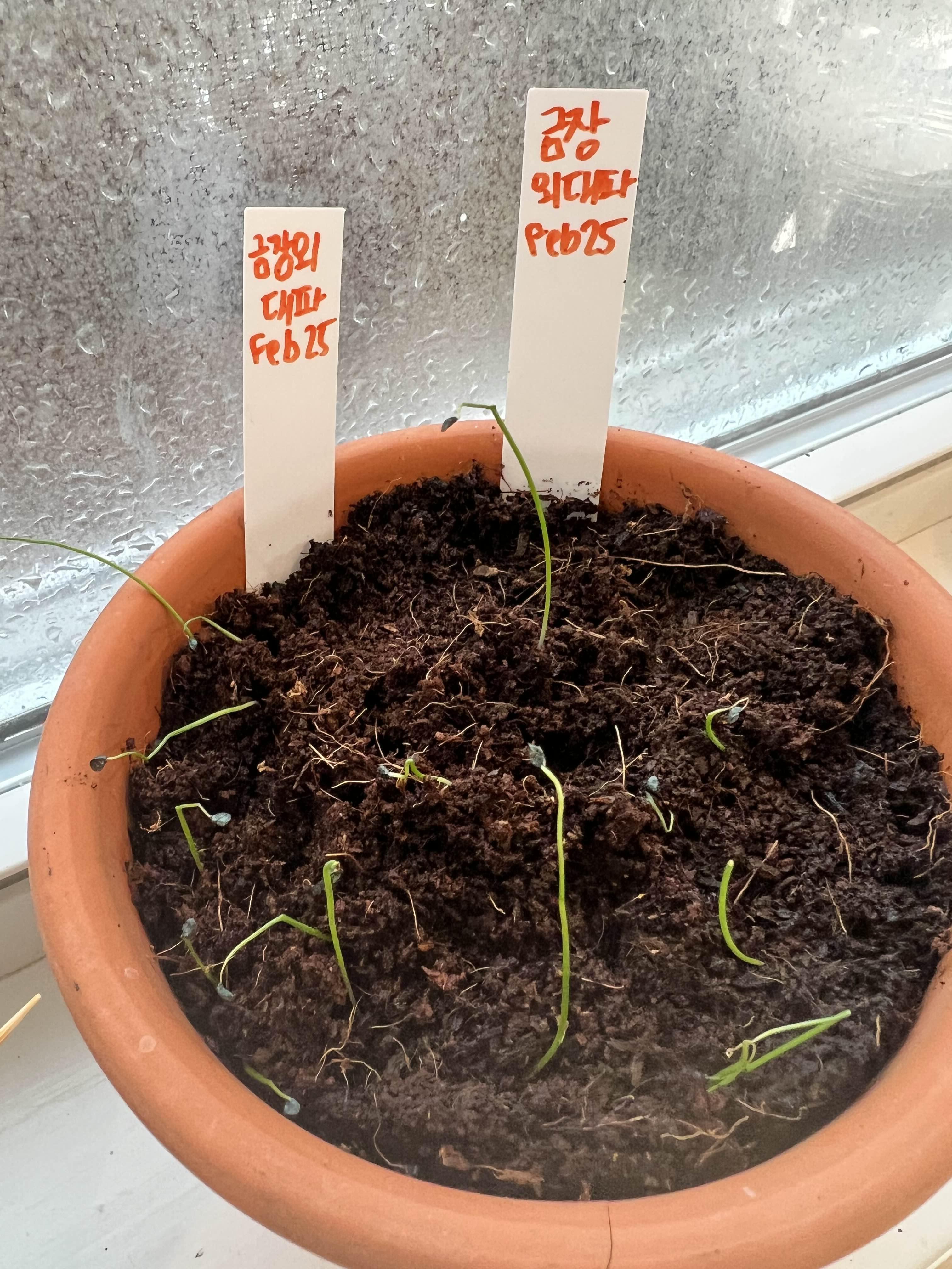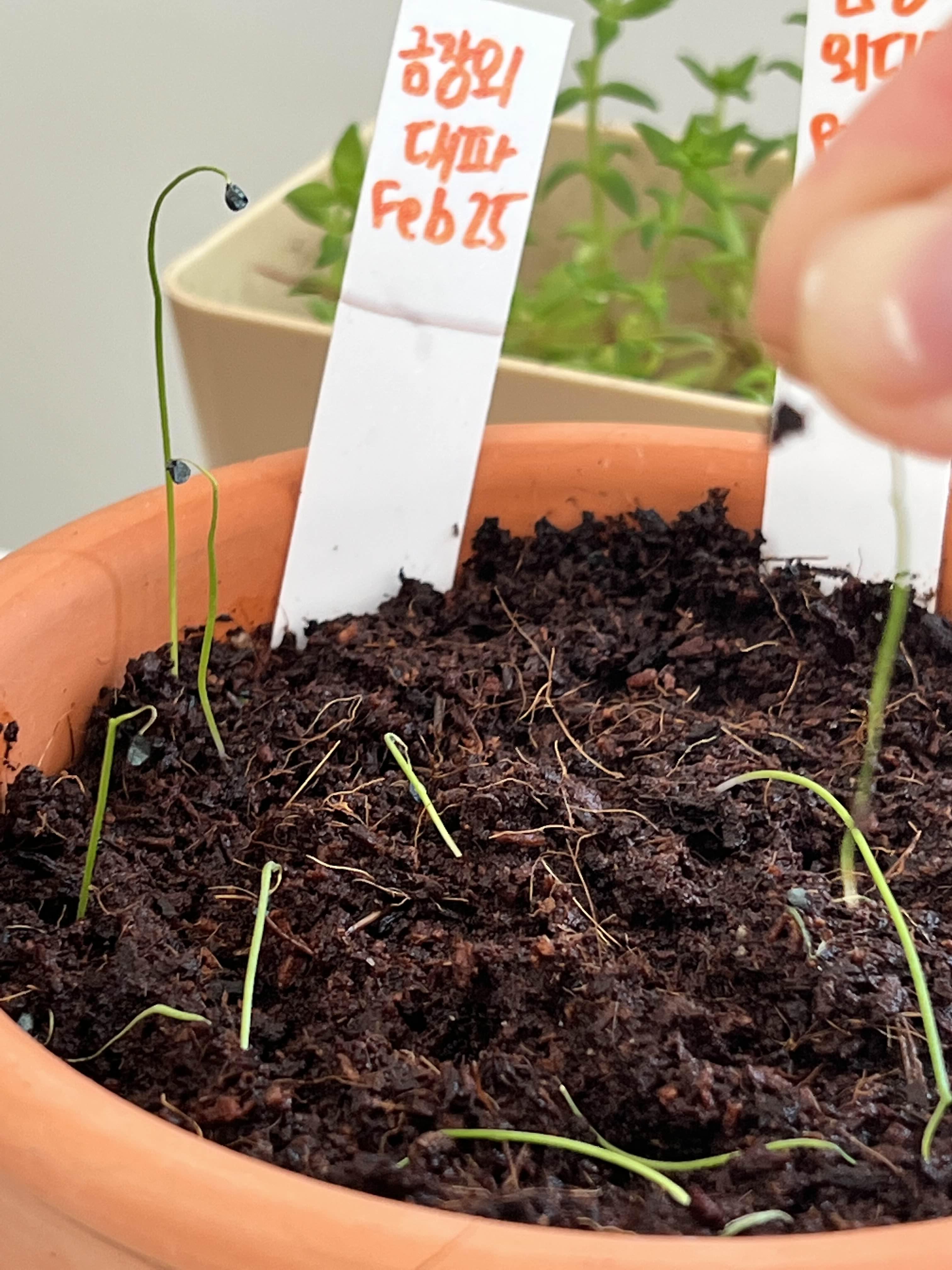 스펀지 안에서 싹이 튼 것들을 화분으로 옮겨줌. 마트에서 산 대파 잘라서 3개 꽂아둔 화분 빈 곳에 심어주었는데, 아직까지는 다 같이 잘 자라고 있음. 다만 그 화분이 물구멍이 없는 화분이라 조금 더 크면 물빠짐이 좋은 토분으로 옮겨줄 예정.