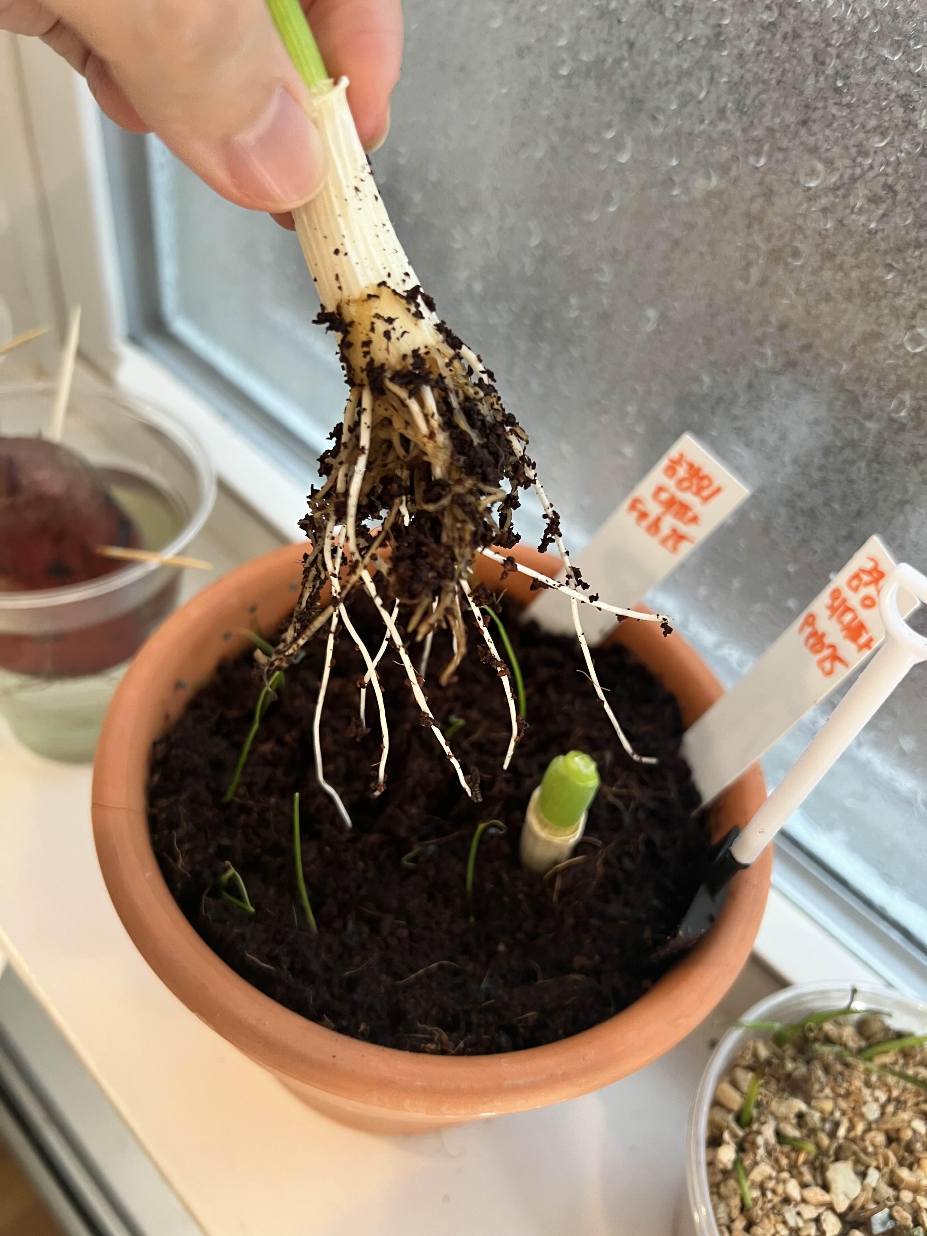 1차 파종분 옮겨 심었던 화분의 원 주인인 마트 대파를 뽑아내주었다. 뿌리가 엄청나게 자라있으면 새싹 대파들이 자라기에 힘들것 같다는 예상을 했는데…