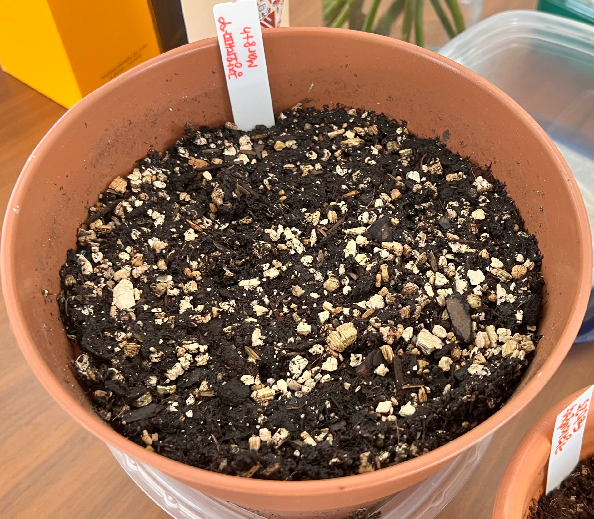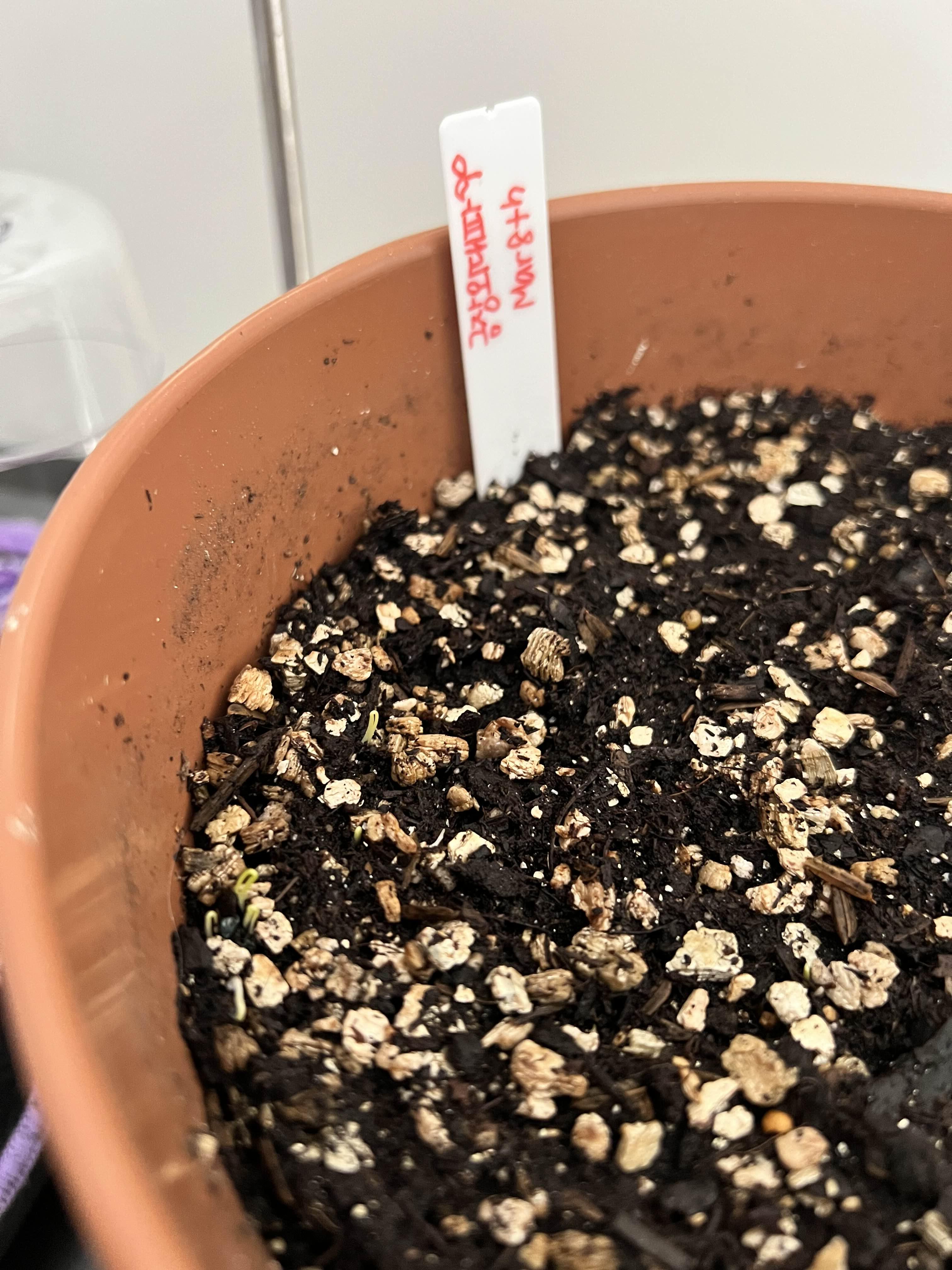 + 2차 파종분 화분에 새싹이 올라오는 것이 보임. 뿌리파리 관리를 위해 테이프 설치.