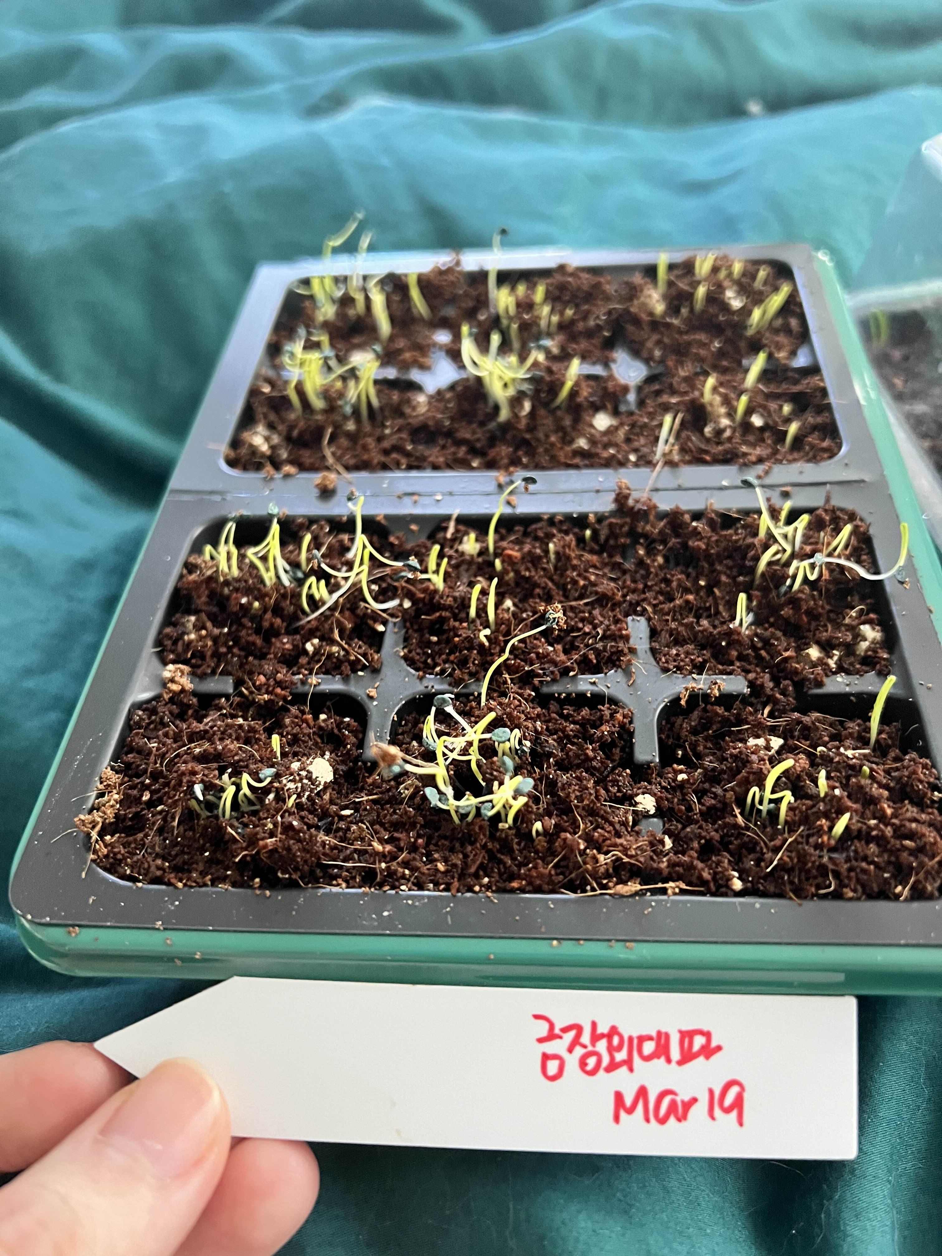 - 여담: 파 종류는 채종 후 발아기한이 1년정도라고 한다. 묵은 씨앗이라 발아가 잘 안될 수도 있음. 작년에도 같은 씨앗으로 발아시켜보았지만, 초반에 가늘게 올라올때 물 조절과 복토에 신경을 못 써서 반은 말라죽고 반은 뿌리파리(?)로 추정되는 것의 공격으로 전부 죽어버렸음.